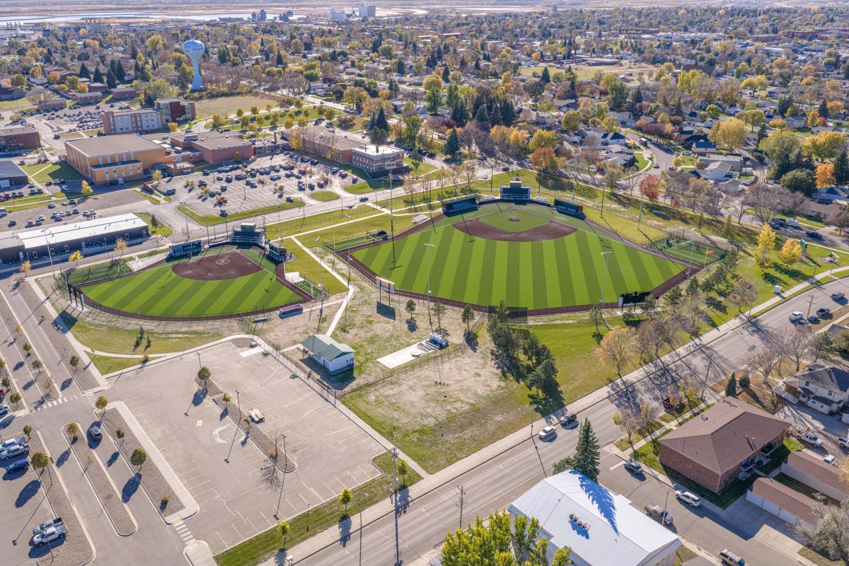 Lowry Engineering partnered with Icon Architectural Group, on the WSC Turf Complex project. The basis of this project, was converting both baseball and softball diamonds at Williston State College to synthetic turf. While the existing natural grass fields were designed with some slope for drainage, artificial turf is required to be essentially flat. To ensure the turf performed properly, we needed to design an extensive underground storm drainage system, with larger trunk storm sewer along the perimeter of the fields. Both fields were graded to have very minimal slope (according to turf design standards) and flat drain tile was installed every 40’ within the playing fields. A watermain, which served part of campus and ran under the softball field, was also rerouted around the perimeter.